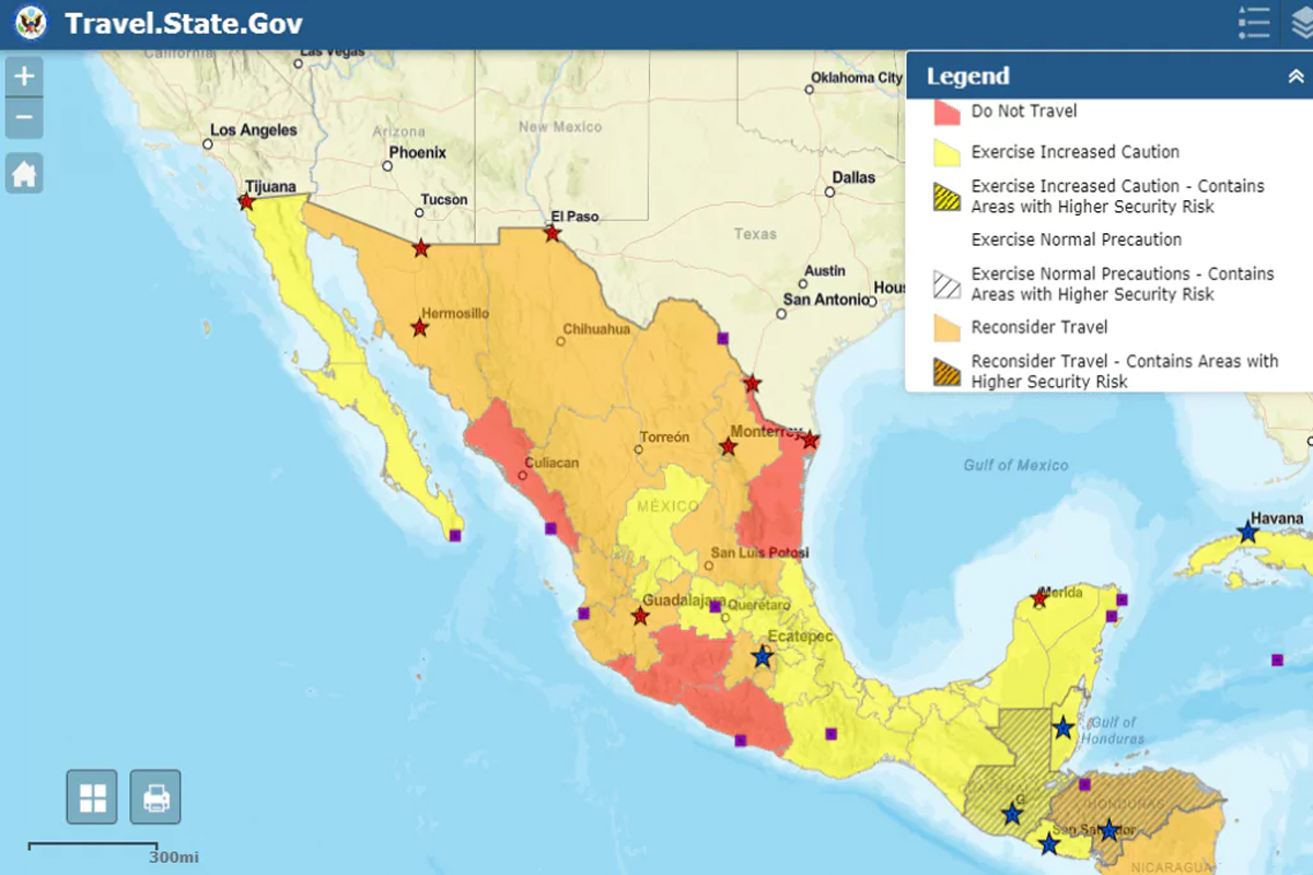 En ese sentido, algunos destinos en el país se mantienen bajo alerta de nivel 2, que implica “extremar precaución”, mientras que otros como Colima, Guerrero, Michoacán, Sinaloa, Tamaulipas y Zacatecas están clasificados en nivel 4 por violencia de grupos armados.