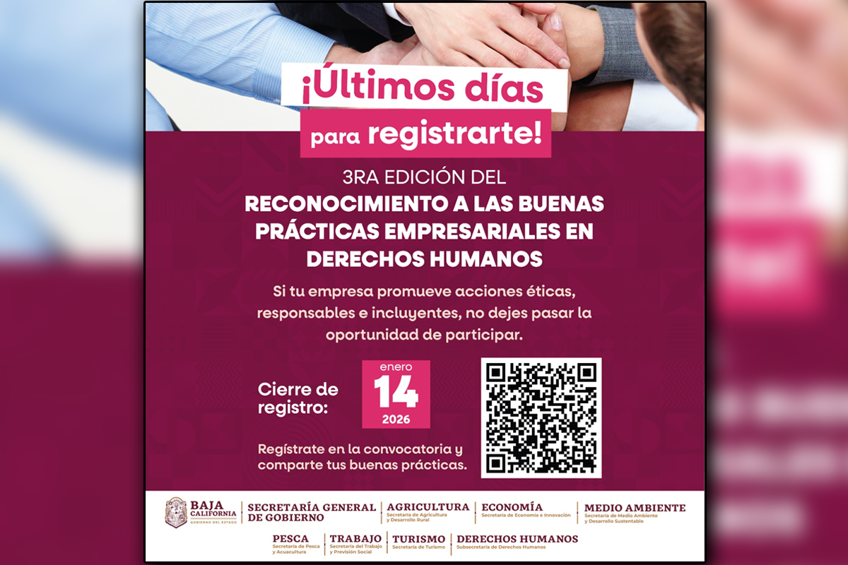 Empresas de Baja California aún pueden registrarse en la tercera edición del Reconocimiento a las Buenas Prácticas Empresariales en Derechos Humanos, cuya convocatoria entra en su etapa final y cierra el próximo 14 de enero de 2026.