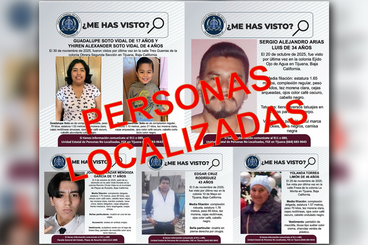 Seis personas que habían sido reportadas como desaparecidas en Tijuana y Playas de Rosarito han sido localizadas. La labor fue realizada en conjunto con la Fiscalía Especializada en la Investigación de Desapariciones, un organismo dedicado a investigar estos casos y garantizar la seguridad de las personas.