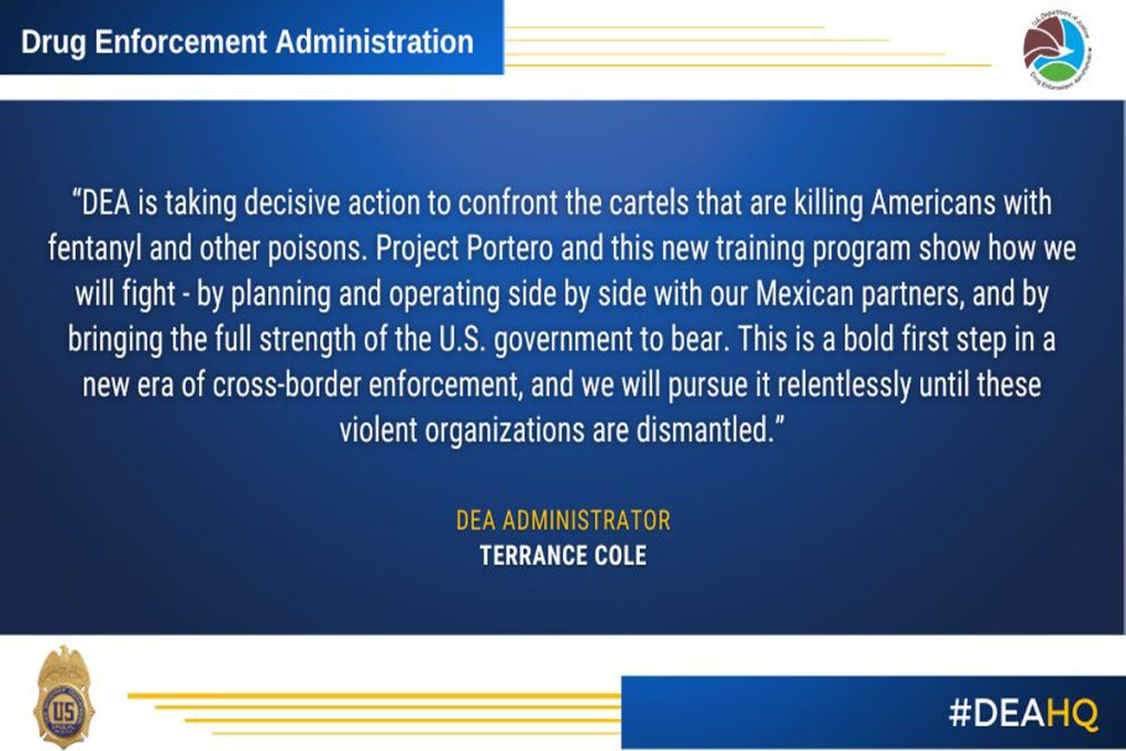 Según la DEA, el plan contempla también programas de capacitación y cooperación de varias semanas en un centro de inteligencia fronterizo, con presencia de investigadores mexicanos, fiscales, fuerzas de seguridad y personal militar.