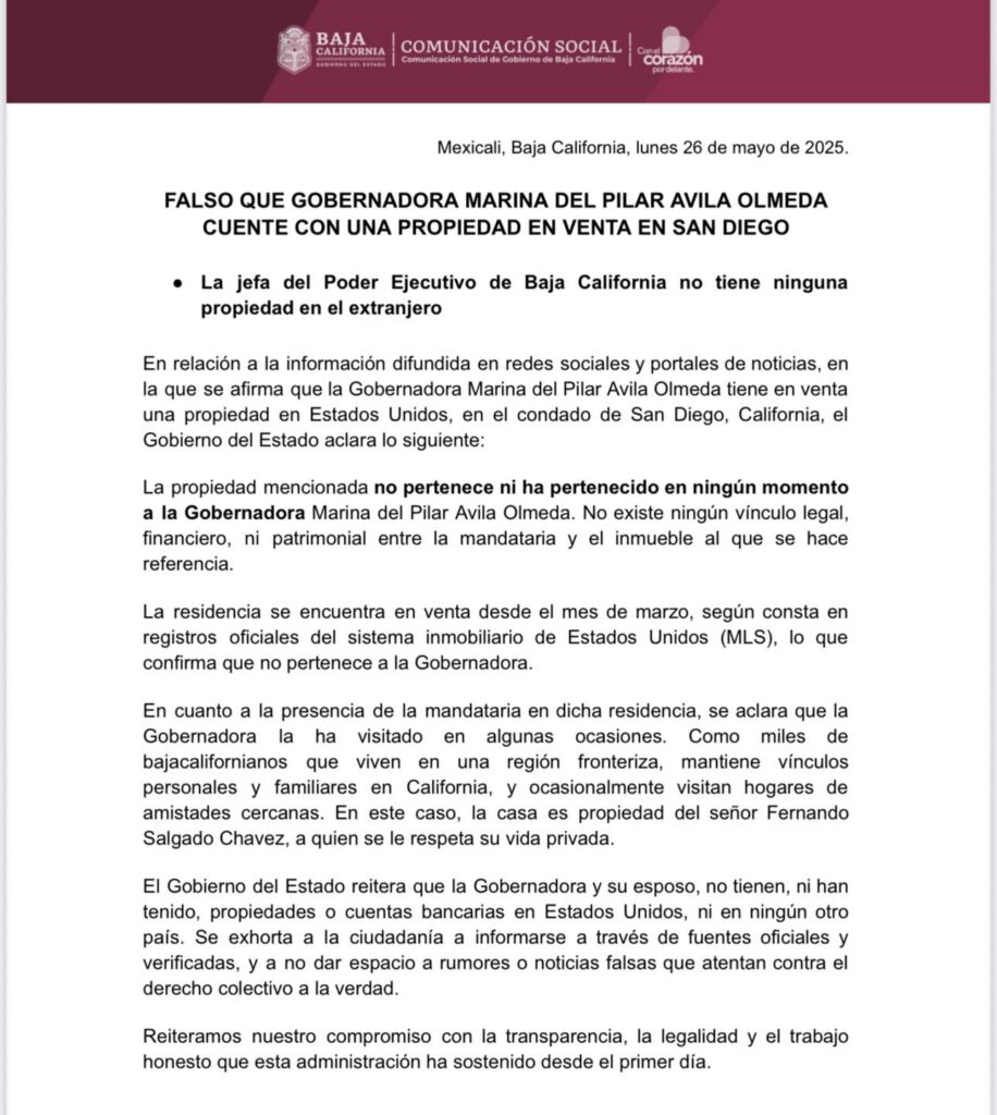 El Gobierno del Estado de Baja California ha desmentido categóricamente la información que circula en redes sociales y algunos portales de noticias, la cual afirma que la gobernadora Marina del Pilar Avila Olmeda tiene una propiedad en venta en el condado de San Diego, California, Estados Unidos.