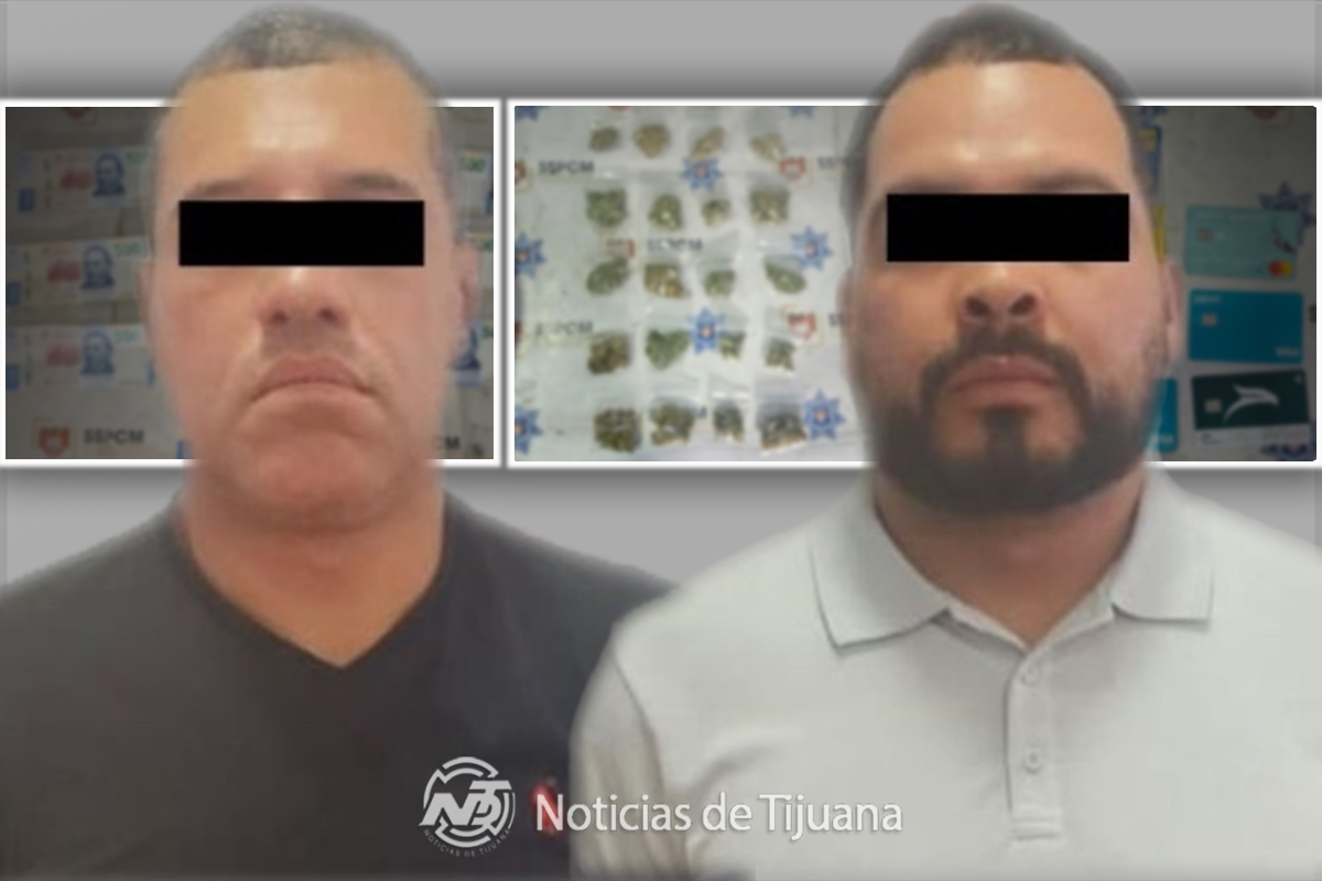 Dos hombres fueron detenidos por agentes de la Policía Municipal luego de ser sorprendidos con presunta droga y varias tarjetas bancarias durante una revisión derivada de una infracción de tránsito en la Zona Centro de Tijuana.