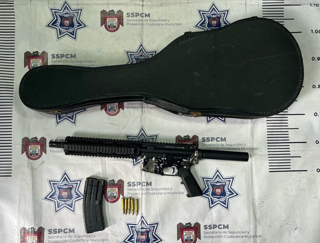El sujeto, identificado como Olsen “N”, vestía tenis blancos, pantalón tipo pants negro y chamarra con capucha verde quien, al notar la presencia de los oficiales, arrojó al suelo un estuche para guitarra, la cual se abrió revelando en su interior un arma de fuego tipo fusil.