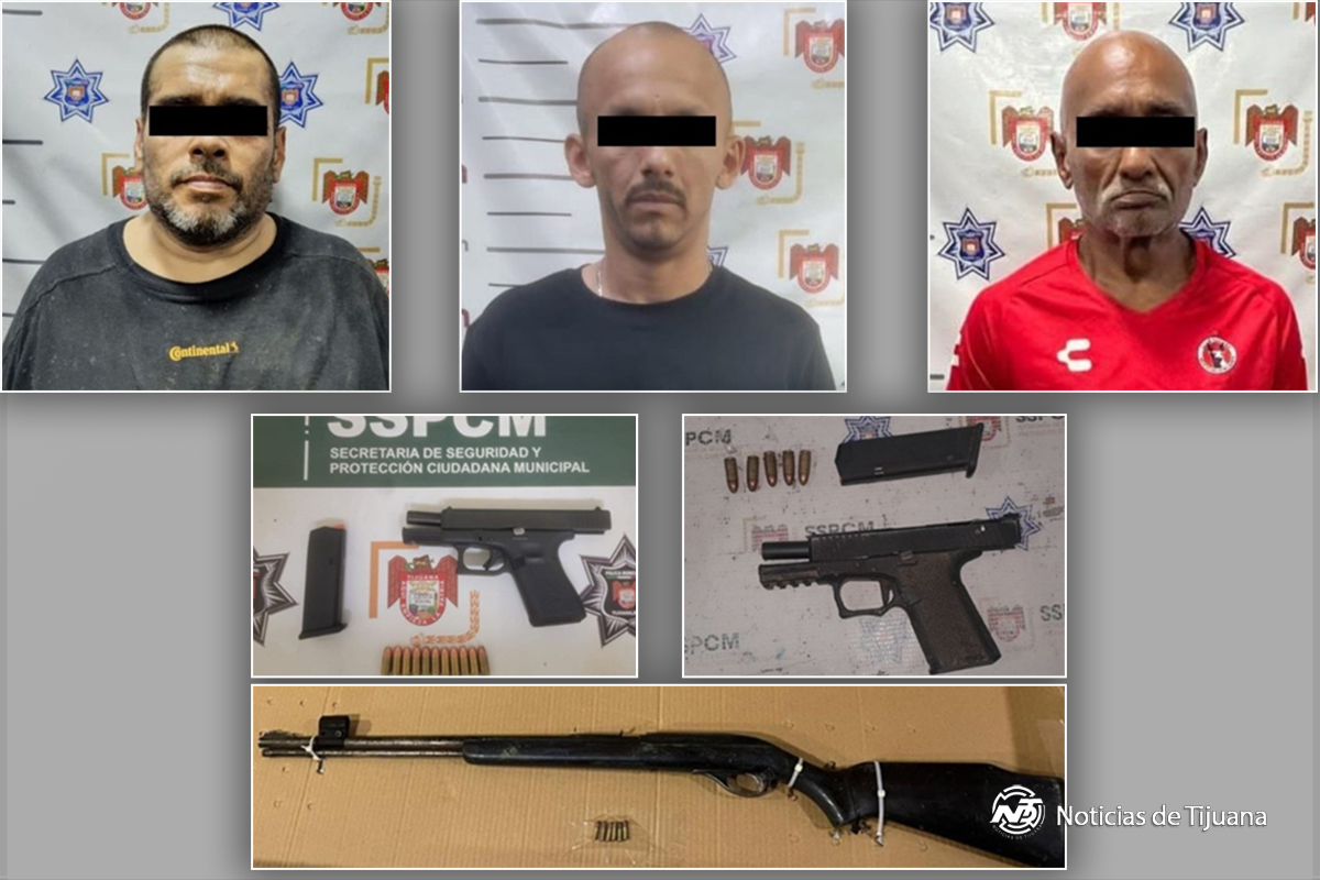 Tres hombres fueron detenidos en diferentes colonias de Tijuana por la presunta portación de armas de fuego, en hechos ocurridos durante recorridos de vigilancia.