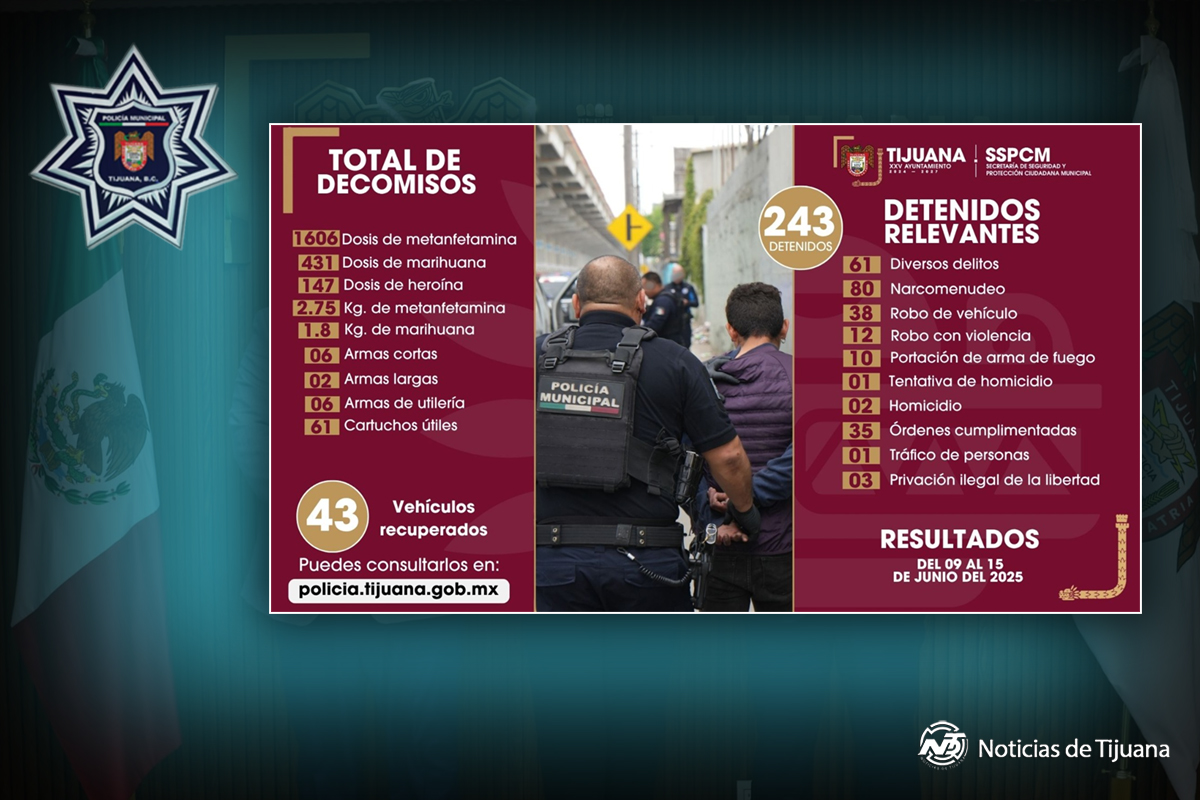 Durante la semana del 9 al 15 de junio, la Policía Municipal de Tijuana detuvo a 243 personas por diversos delitos, como parte de operativos preventivos y estrategias de seguridad.
