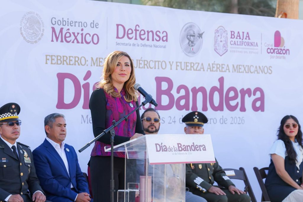 La gobernadora Marina del Pilar Avila Olmeda encabezó la ceremonia por el Día de la Bandera en el cuartel del 23 Regimiento de Caballería Motorizada, en Mexicali.