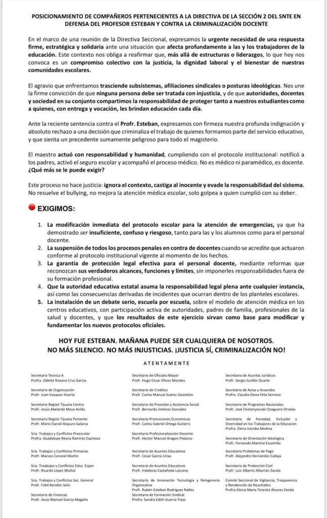 Los manifestantes subrayaron que su lucha no pretende eludir responsabilidades, sino impulsar un sistema escolar seguro y transparente. “Hoy fue Esteban; mañana podemos ser cualquiera de nosotros. Justicia sí, criminalización no”, concluye el documento del SNTE, insistiendo en que las autoridades estatales y el sindicato deben trabajar de la mano para garantizar la protección de alumnos y docentes.