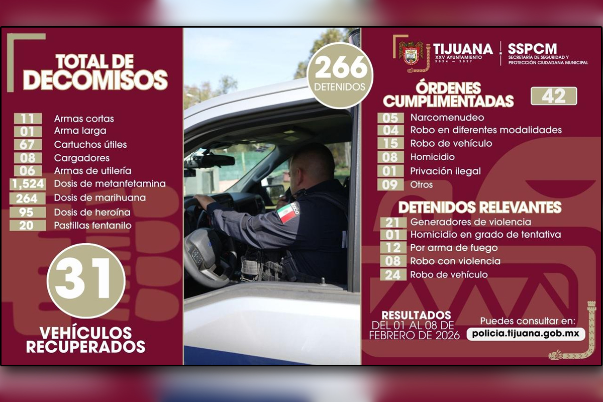 Del 1 al 8 de febrero, la Policía Municipal detuvo a 266 personas por diversos delitos y aseguró 12 armas de fuego en distintos operativos realizados en la ciudad.
