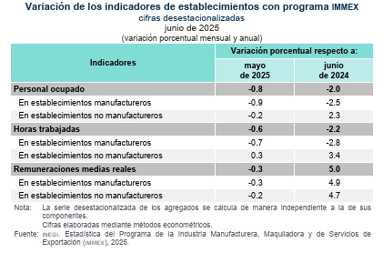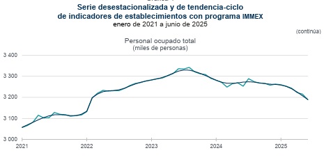 Durante junio de 2025, los establecimientos con programa IMMEX reportaron una reducción de 0.8% en personal ocupado a nivel nacional, de acuerdo con cifras publicadas por el Instituto Nacional de Estadística (INEGI).