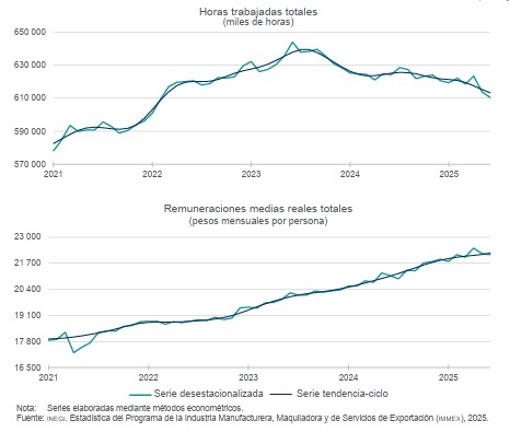 Respecto a las horas, las manufactureras disminuyeron 0.7 %, mientras que las no manufactureras aumentaron 0.3%. Por su parte, las remuneraciones medias reales al personal contratado directamente descendieron 0.3% en dicho periodo.