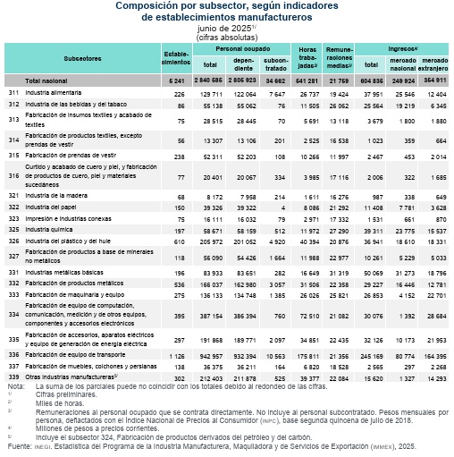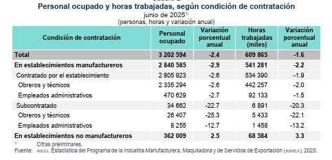 En cuanto al total de personal ocupado en el país, este fue de 3 millones 202 mil 594 personas, lo que representó un descenso anual de 2.4%; en los manufactureros cayó 2.9 %, mientras que en los no manufactureros aumentó 2.5%.