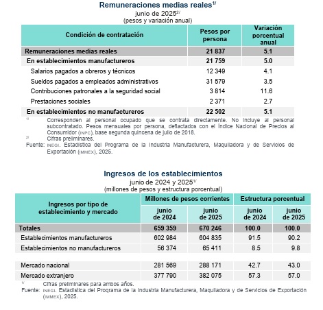 Asimismo, durante junio de 2025 se contabilizaron 6 mil 562 establecimientos bajo el esquema IMMEX, de los cuales 5 mil 241 se dedicaron a la manufactura y mil 321 a actividades vinculadas con servicios, comercio y sector primario.