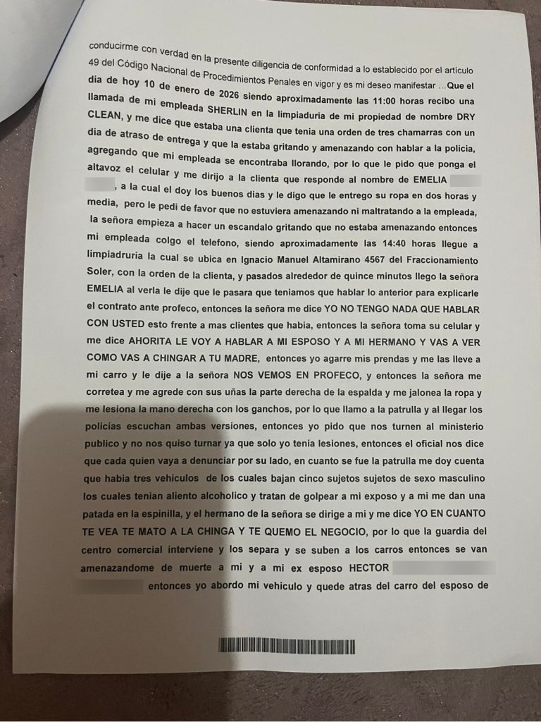 De acuerdo con la declaración de la propietaria, alrededor de las 11:00 horas recibió una llamada de su empleada, Sherlin, quien le informó que una clienta reclamaba de manera agresiva una orden de tres chamarras con un día de retraso en la entrega, situación que derivó en gritos, amenazas y en que la trabajadora rompiera en llanto.