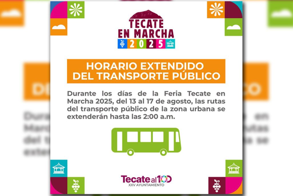 Pensando en el bienestar y comodidad de las familias tecatenses y de quienes visitan el municipio, el Gobierno de Tecate implementará un horario especial de transporte público durante la Feria Tecate en Marcha 2025, del 13 al 17 de agosto, para que nadie se quede sin disfrutar de esta gran celebración.