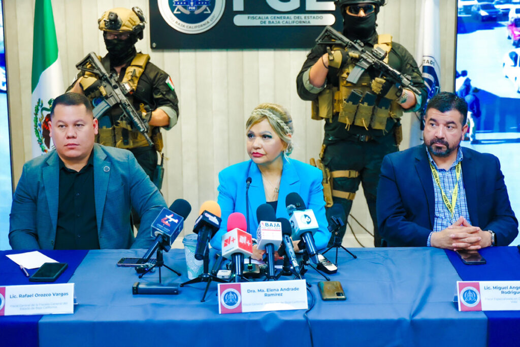 La Fiscal General del Estado, Dra. Ma. Elena Andrade Ramírez, ofreció una conferencia de prensa en la que presentó información relevante sobre recientes vinculaciones de imputados por terrorismo, delincuentes que cometieron actos intencionales, para desestabilizar la paz en nuestro Estado, así como la detención de un generador de violencia en el Valle de Mexicali.