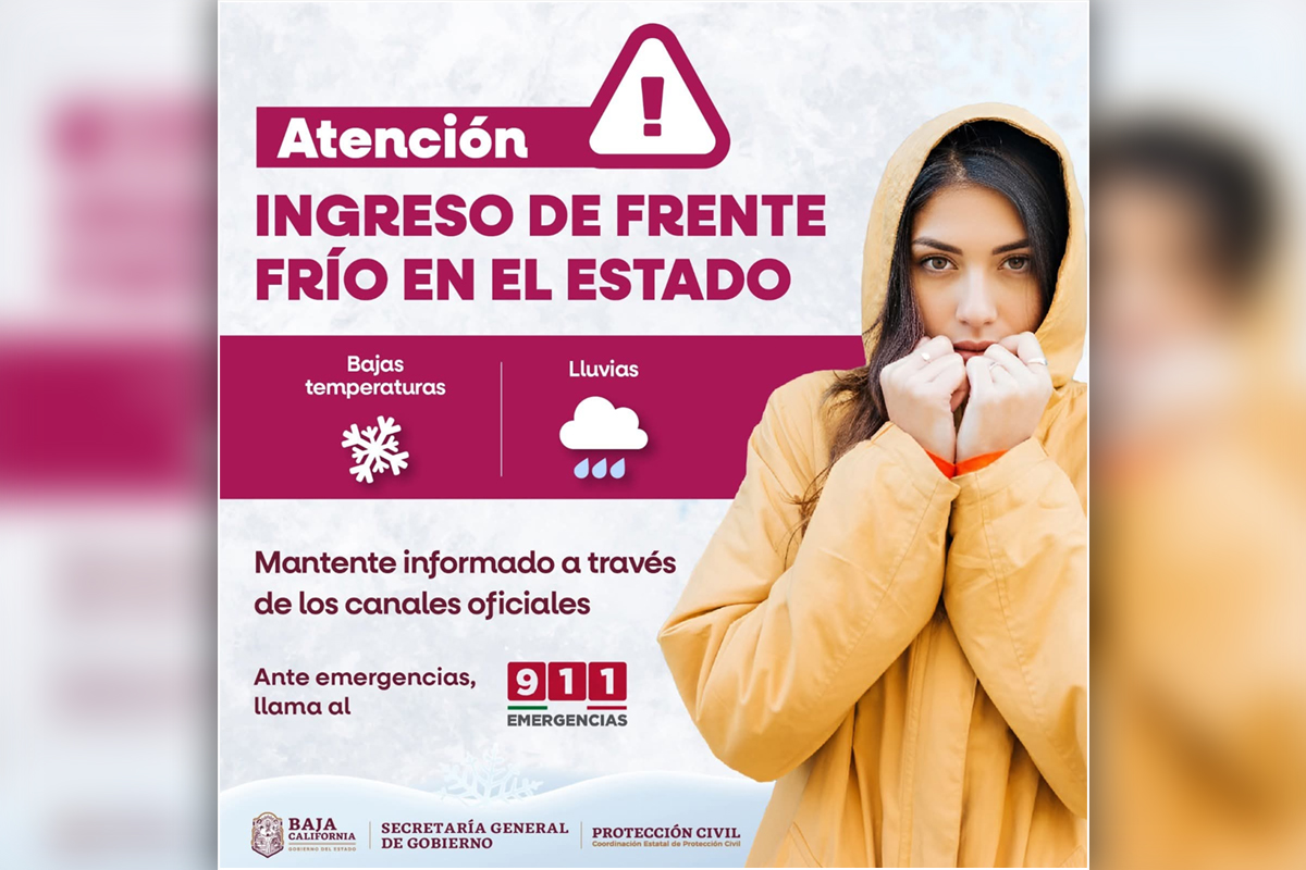 El frente frío número 34 ya va en camino y se espera que deje lluvias, fuertes vientos y un marcado descenso de temperatura en la Zona Costa de Baja California, principalmente en Tijuana, Tecate y Playas de Rosarito.