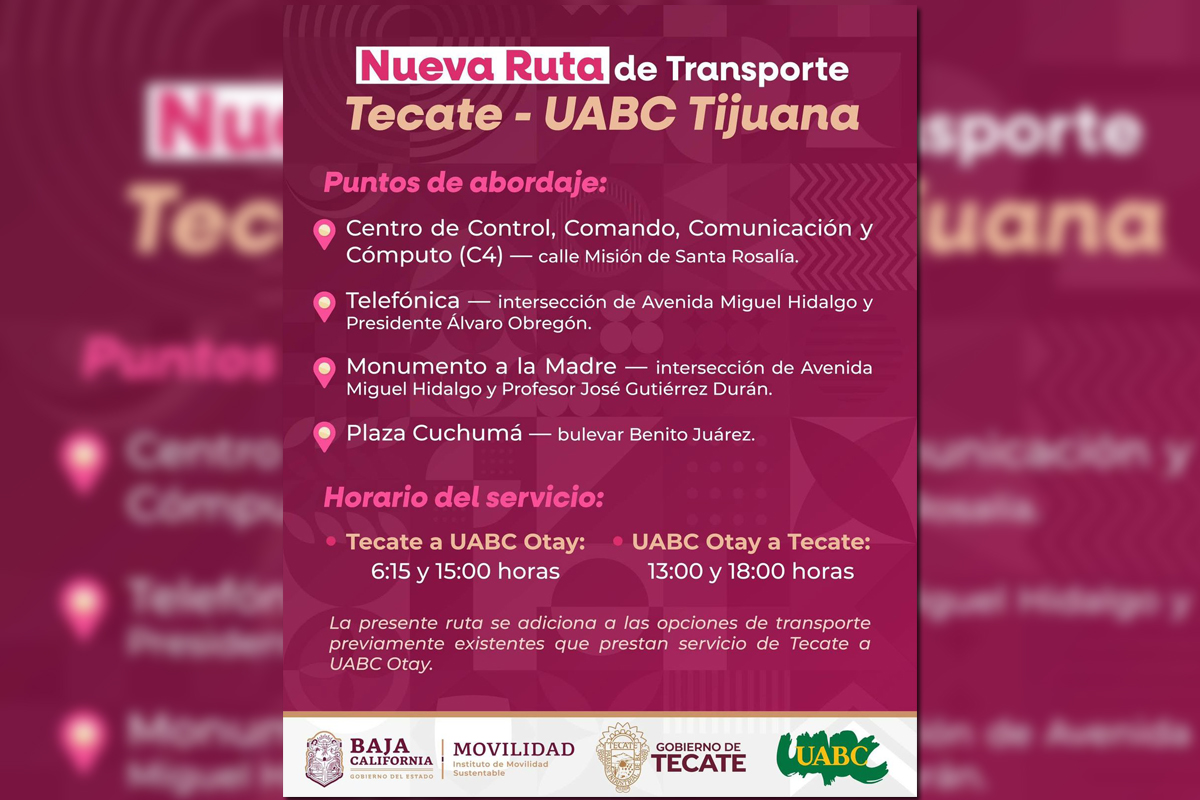 Con el firme compromiso de apoyar a las juventudes en su desarrollo académico, el Gobierno del Estado, a través del Instituto de Movilidad Sustentable (IMOS), pondrá en marcha el servicio gratuito de transporte escolar entre Tecate y el Campus Otay de la Universidad Autónoma de Baja California (UABC), en Tijuana, correspondiente al ciclo escolar 2025-2.
