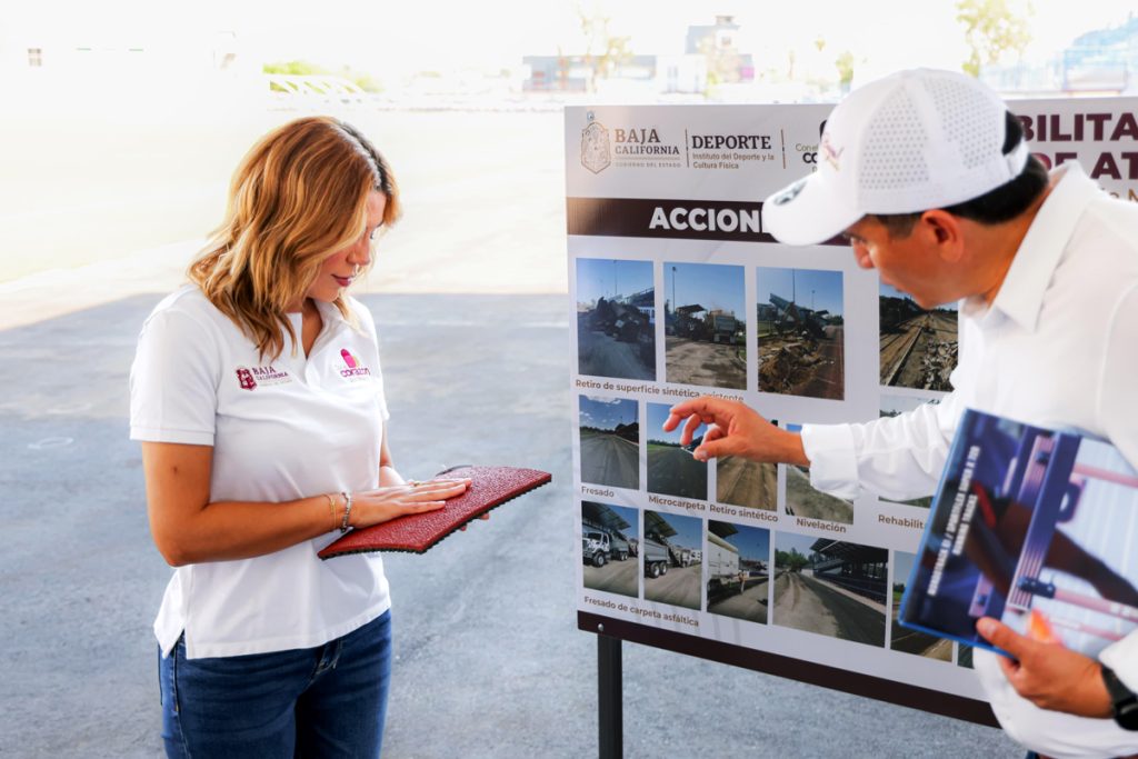 Para garantizar que las y los jóvenes de alto rendimiento cuenten con óptimas instalaciones para su desarrollo deportivo y profesional, la gobernadora Marina del Pilar Avila Olmeda supervisó los trabajos de rehabilitación de la pista de atletismo en la Ciudad Deportiva de Mexicali, obra que representa una inversión de 17 millones de pesos.