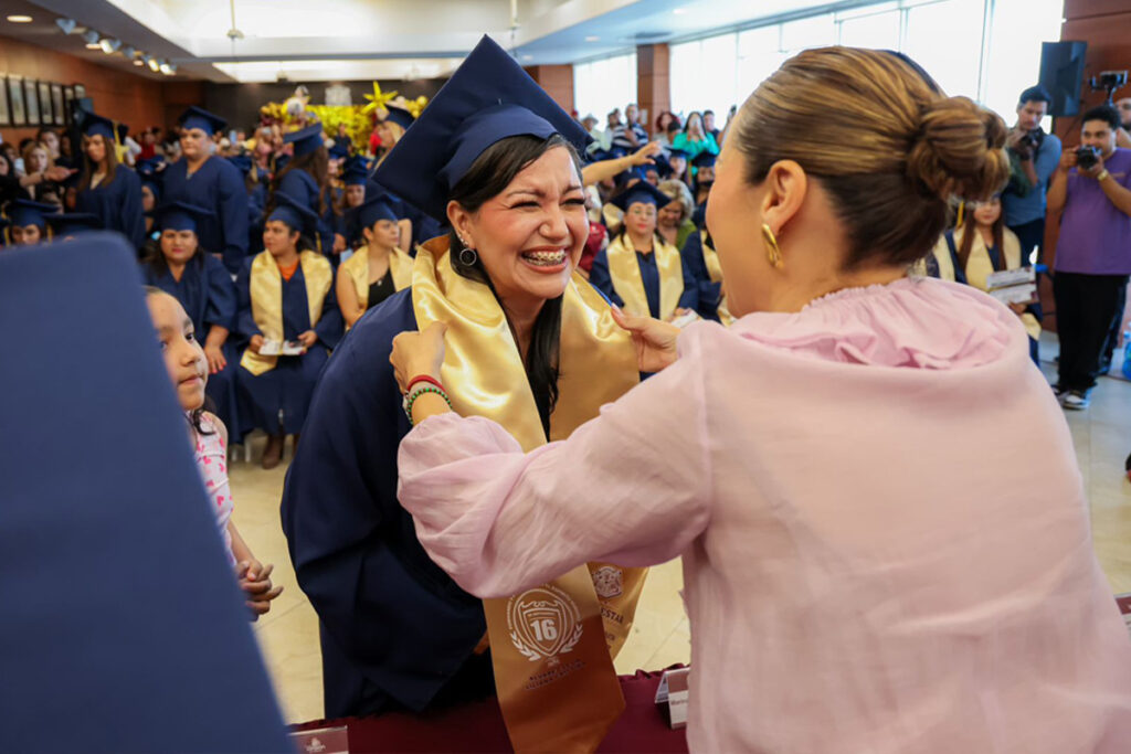 En representación de la primera generación de graduadas, María Paola Juárez Quiñones entregó un reconocimiento a la gobernadora Marina del Pilar, para resaltar su esfuerzo y compromiso en la implementación de un programa que ha permitido a miles de madres trabajadoras y jefas de familia, concluir sus estudios de bachillerato.