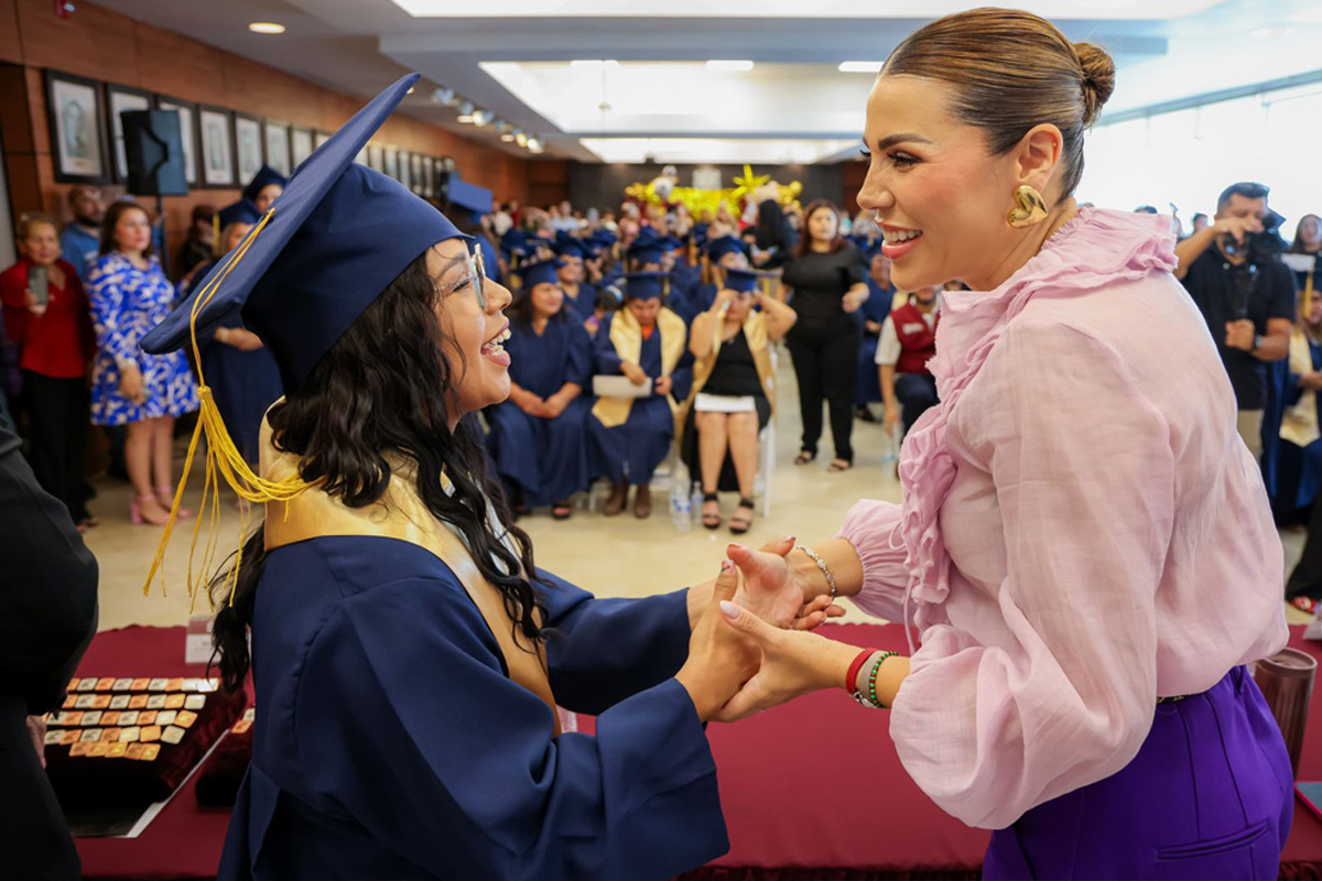 Felicitó a las mujeres graduadas por haber concluido el bachillerato, además de recordar que la Tarjeta Violeta ha pasado de ser un programa a ser un derecho constitucional en Baja California, que va de la mano con el impulso de oportunidades para que las mujeres amplíen sus estudios.