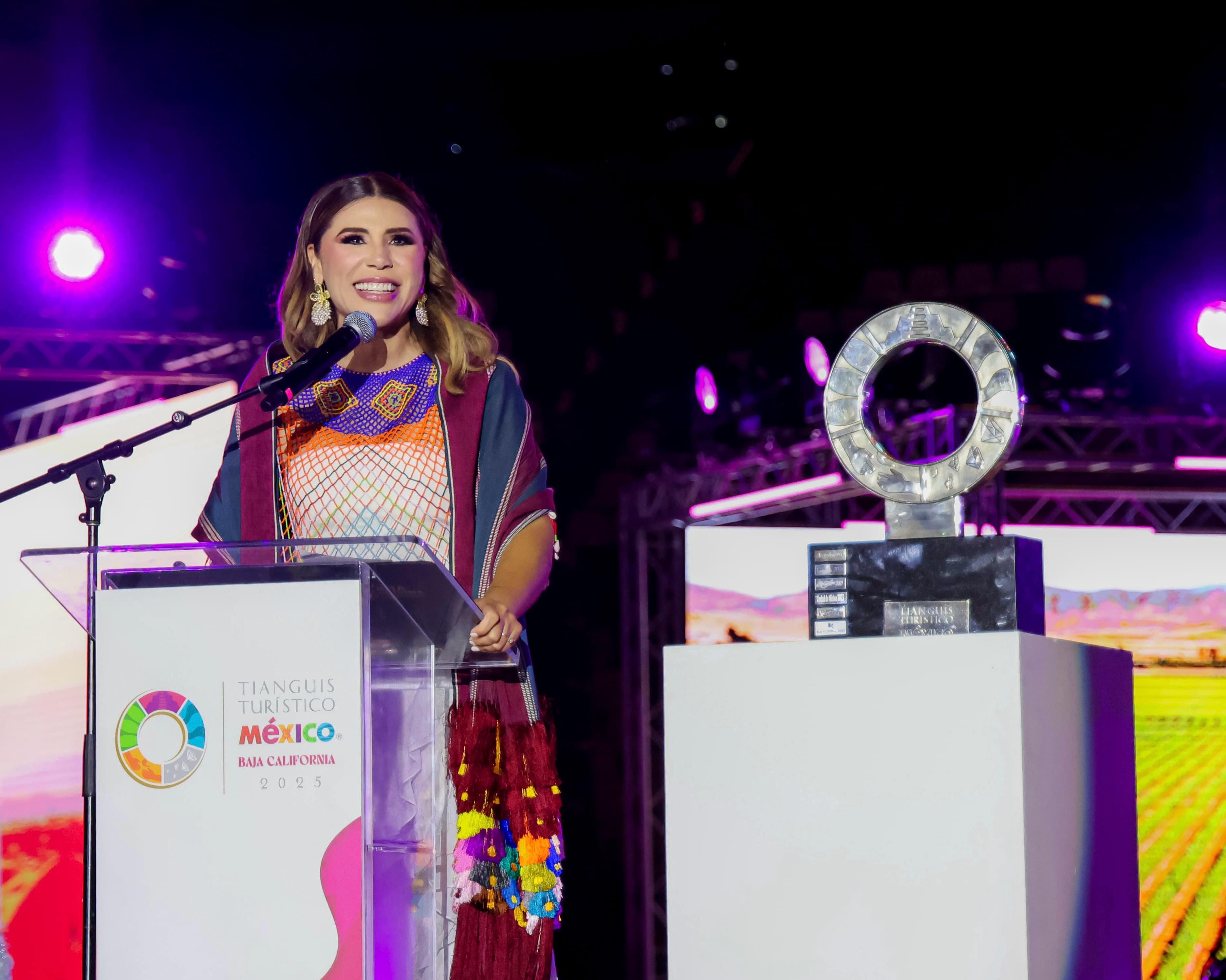 En camino al 50 aniversario del evento de turismo más grande de Latinoamérica, la gobernadora de Baja California Marina del Pilar Avila Olmeda, acompañada de la secretaria de Turismo Josefina Rodríguez Zamora y la gobernadora de Guerrero, Evelyn Salgado Pineda, se realizó la ceremonia de entrega de estafeta del Tianguis Turístico 2026.