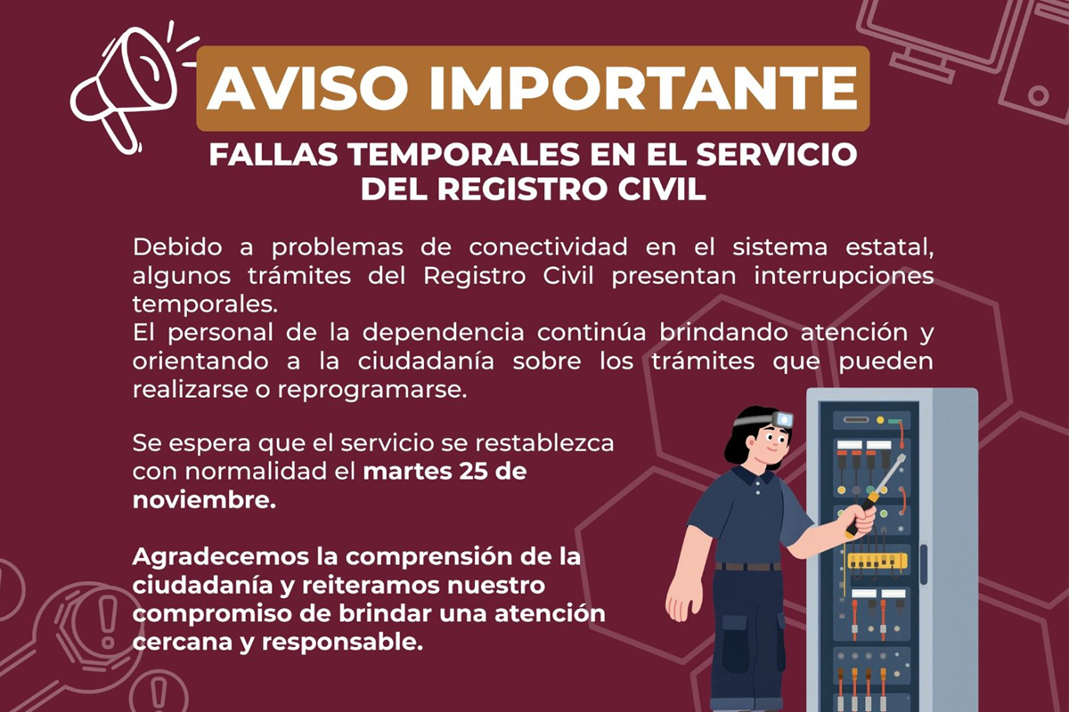 El Gobierno de Tecate informa a la ciudadanía que, debido a fallas técnicas en el sistema de conectividad a internet del Registro Civil, algunos de los servicios que requieren acceso a la plataforma estatal presentan interrupciones temporales.