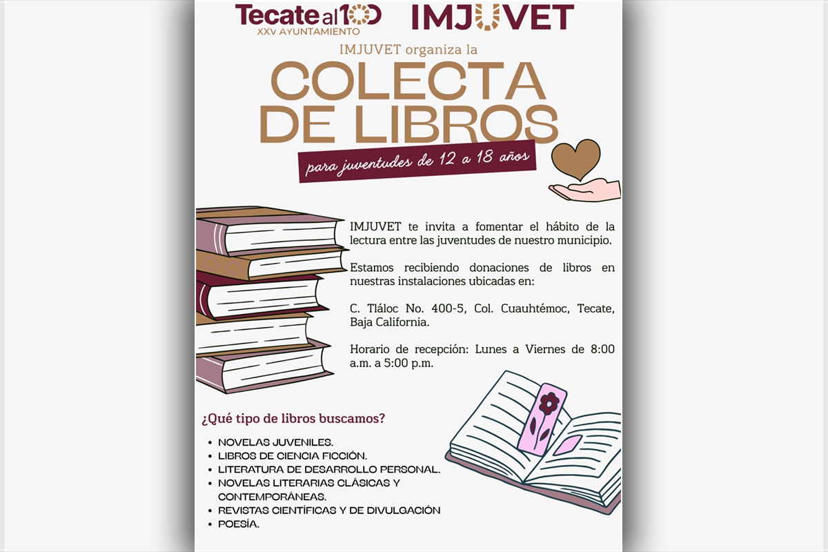 El Gobierno de Tecate, a través del Instituto Municipal de la Juventud (IMJUVET), lanza una invitación a la ciudadanía para sumarse a la Colecta de Libros para Jóvenes de 12 a 18 años, una iniciativa que busca despertar el interés por la literatura, el pensamiento crítico y la creatividad en las nuevas generaciones.