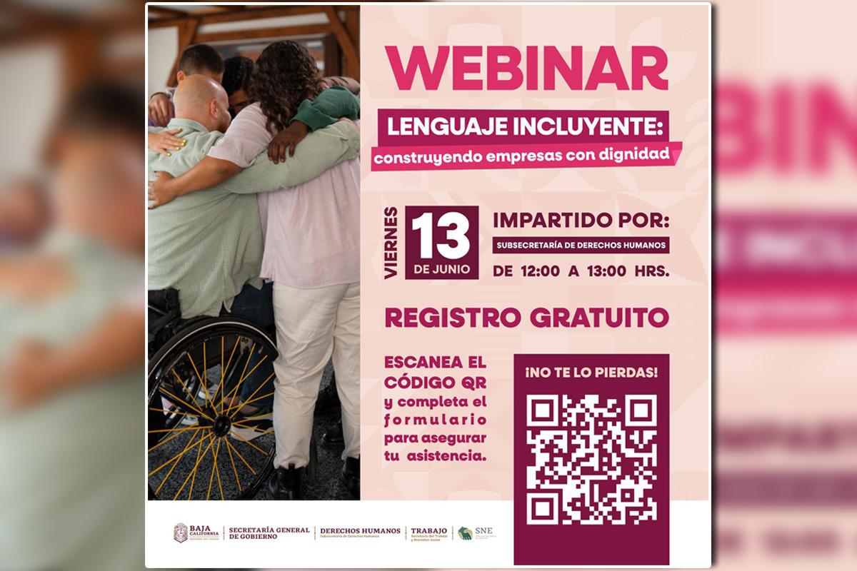 Con el compromiso de construir entornos laborales más dignos, equitativos y accesibles, el Gobierno de Baja California, encabezado por la Gobernadora Marina del Pilar, llevará a cabo el webinar “Lenguaje incluyente: construyendo empresas con dignidad”, dirigido al personal de Recursos Humanos y directivos de empresas en el estado.