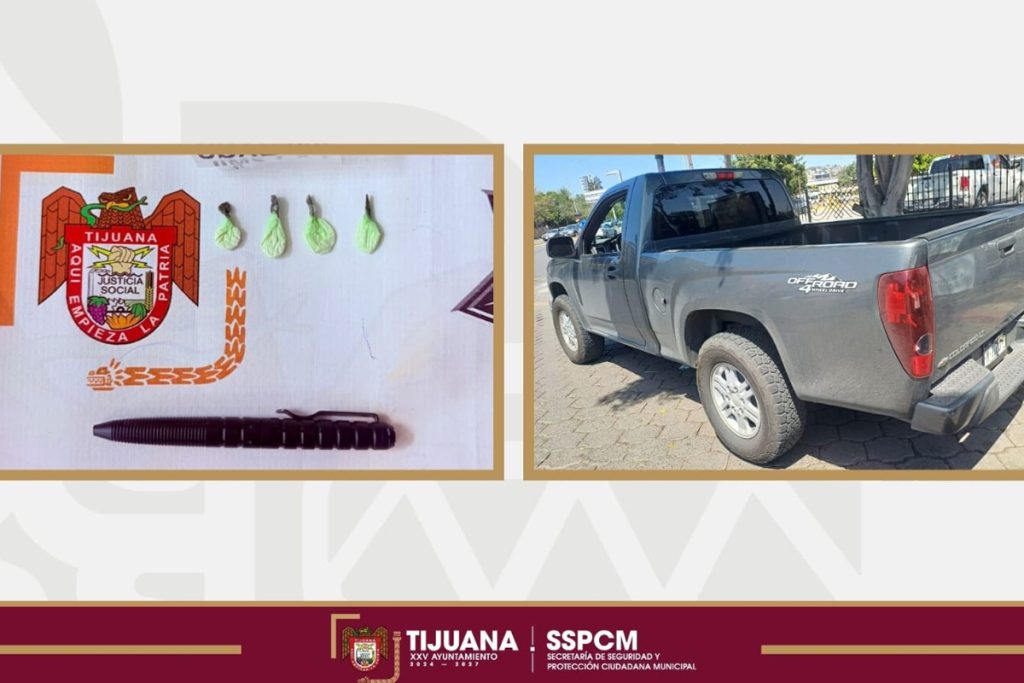 TIJUANA, BC, (NDT).- La intervención ocurrió la tarde de este viernes, cuando elementos de la Secretaría de Seguridad y Protección Ciudadana Municipal observaron a un conductor de un vehículo tipo pick-up cometiendo diversas infracciones al reglamento de tránsito. Al marcarle el alto y realizar una revisión precautoria, los oficiales localizaron cuatro envoltorios con una sustancia con características similares a la droga conocida como cristal.