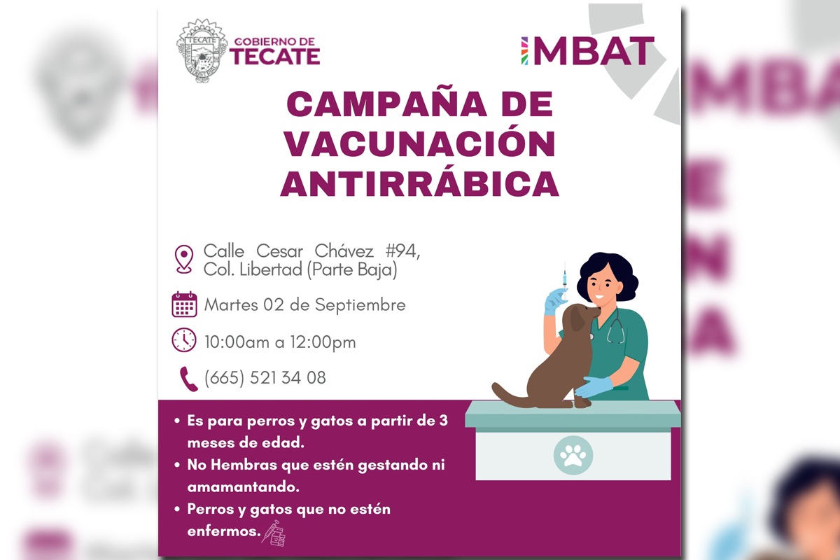 El Instituto Municipal de Bienestar Animal de Tecate (IMBAT), continúa acercando la Campaña de Vacunación Antirrábica Gratuita a distintos puntos del municipio, en esta ocasión, la jornada se realizará el martes 02 de septiembre en la colonia Libertad (parte baja), en un horario de 10:00 de la mañana a 12:00 del mediodía.