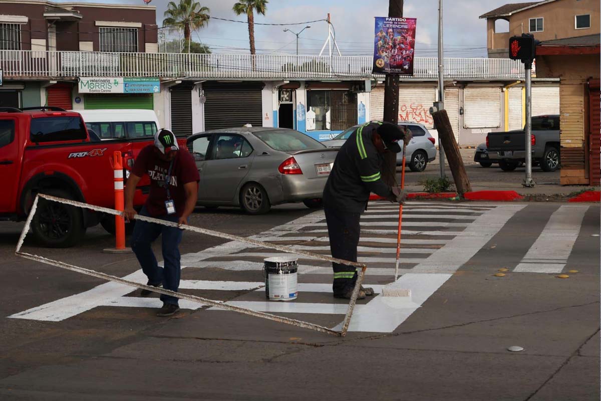 En la Delegación Otay Centenario, las cuadrillas municipales realizaron trabajos de limpieza y mantenimiento sobre la Calzada Tecnológico, en la colonia Tomás Aquino, donde se rehabilitaron 250 metros cuadrados de señalética y se retiró media tonelada de maleza, mejorando un cruce peatonal clave para estudiantes y vecinos de la zona.