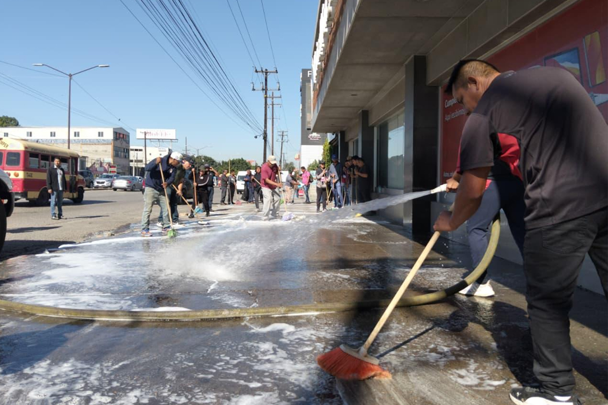 Posteriormente, las obras continuaron sobre el bulevar Díaz Ordaz, de la Delegación La Mesa, donde se intervinieron cerca de mil 700 metros cuadrados, con el barrido y lavado de la banqueta, contando con el valioso apoyo de comerciantes de la zona quienes se sumaron a los esfuerzos de limpieza.