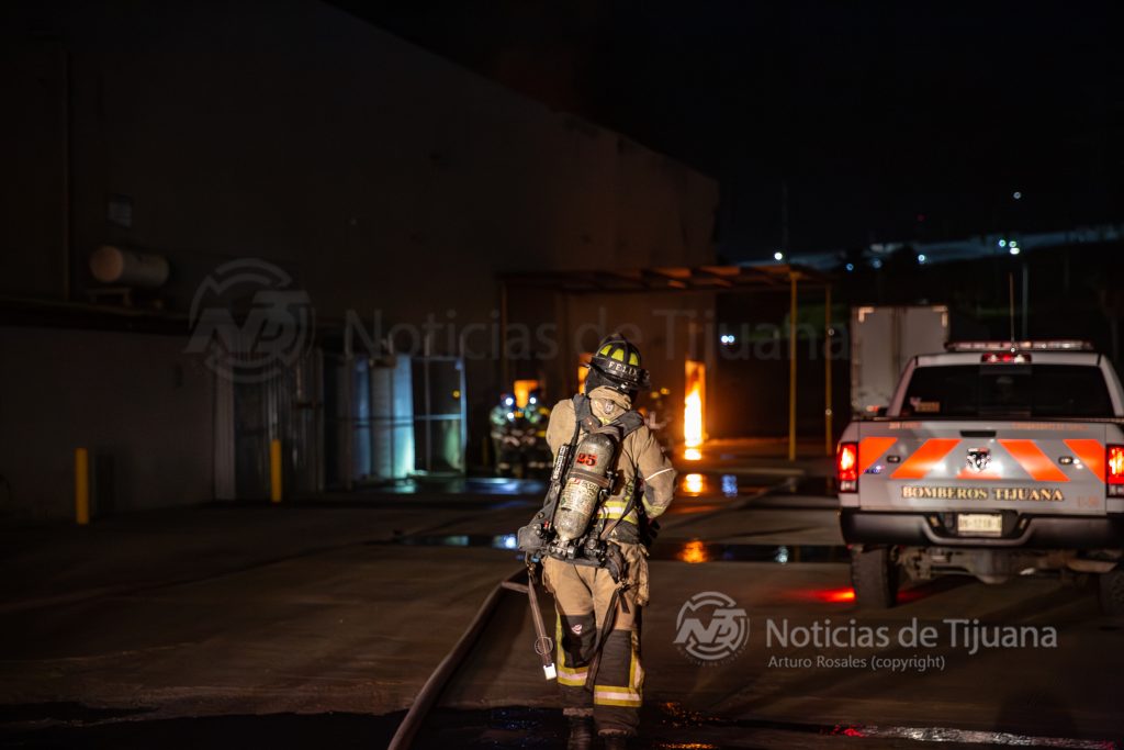 Tijuana.– Un incendio de gran magnitud consumió un almacén de foam la noche de este jueves dentro de la nave industrial de la empresa Jumbolon de México, ubicada en el Parque Industrial El Florido, generando una intensa movilización de cuerpos de emergencia que evitaron que las llamas se extendieran al resto de las instalaciones.