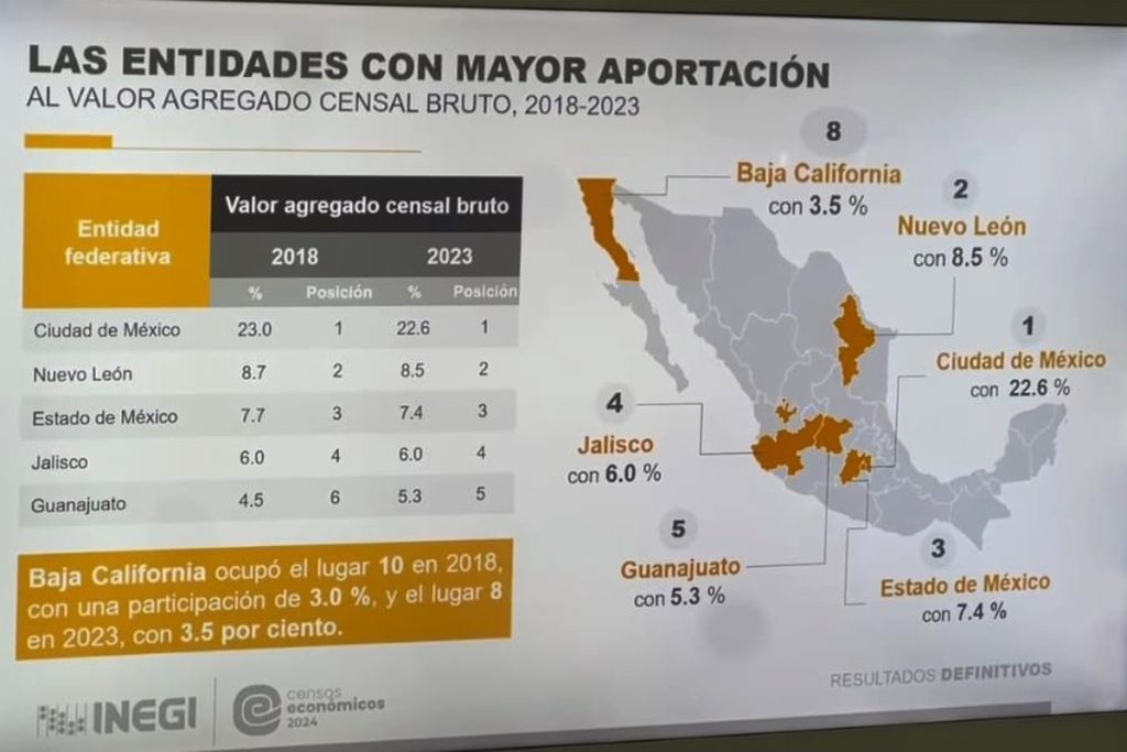 Humberto Ibarra Picos, coordinador estatal del INEGI, explicó que se registraron 142 mil 150 unidades económicas en la entidad las cuales emplean a más de 1.3 millones de personas, destacándose la ciudad de Tijuana, que concentra el 55.2% del valor agregado estatal.