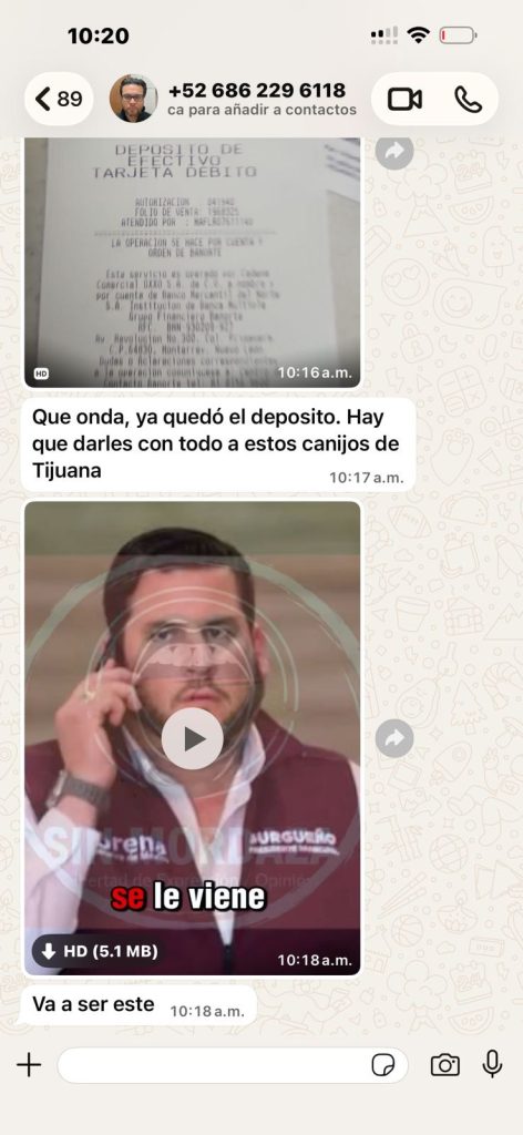 En un mensaje de WhatsApp dirigido a un operador, el funcionario confirma “ya quedó el depósito”, ordena “darles con todo a estos canijos de Tijuana” y comparte un video dirigido contra Burgueño. El material terminó publicado en una página de Facebook de reciente creación, disfrazada de “contenido político”, pero operada desde el anonimato.