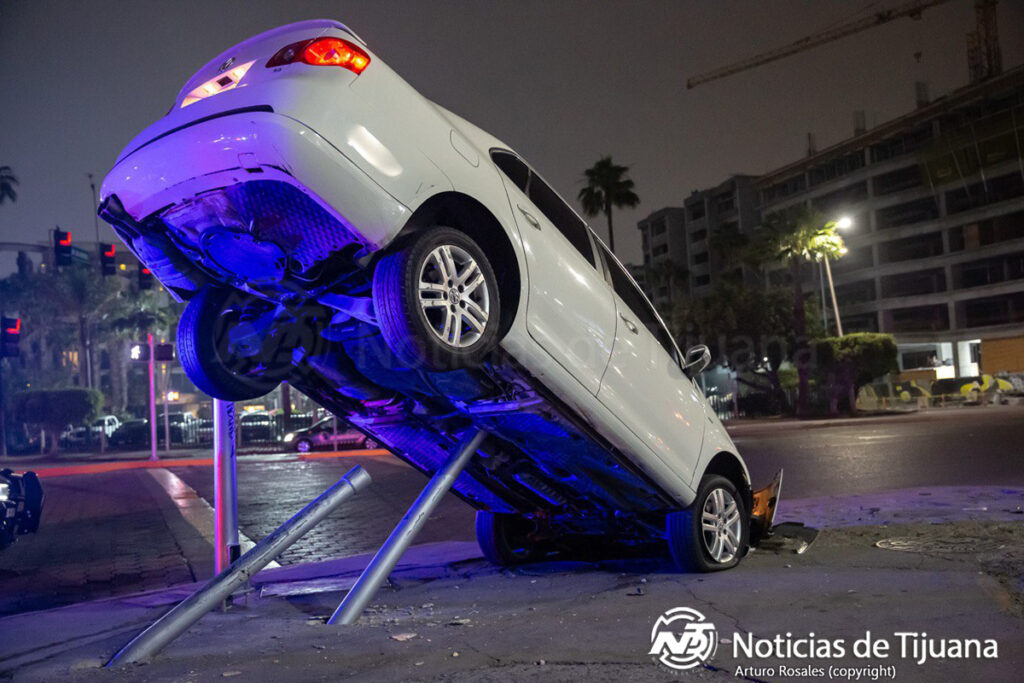 La madrugada del domingo 15 de junio, un vehículo Volkswagen Jetta con placas de California quedó parcialmente suspendido luego de perder el control y chocar con unas barras metálicas, esto sobre el bulevar Abelardo L. Rodríguez.