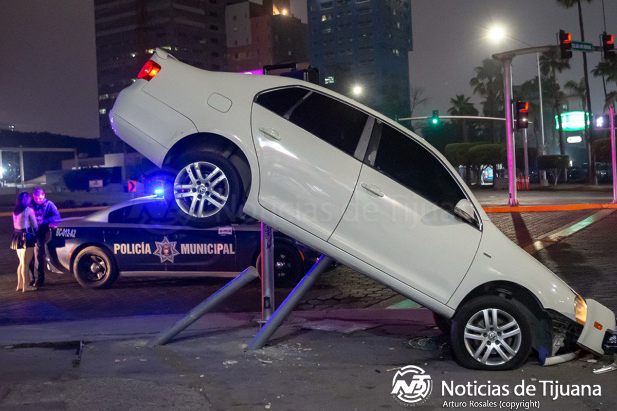 La madrugada del domingo 15 de junio, un vehículo Volkswagen Jetta con placas de California quedó parcialmente suspendido luego de perder el control y chocar con unas barras metálicas, esto sobre el bulevar Abelardo L. Rodríguez.