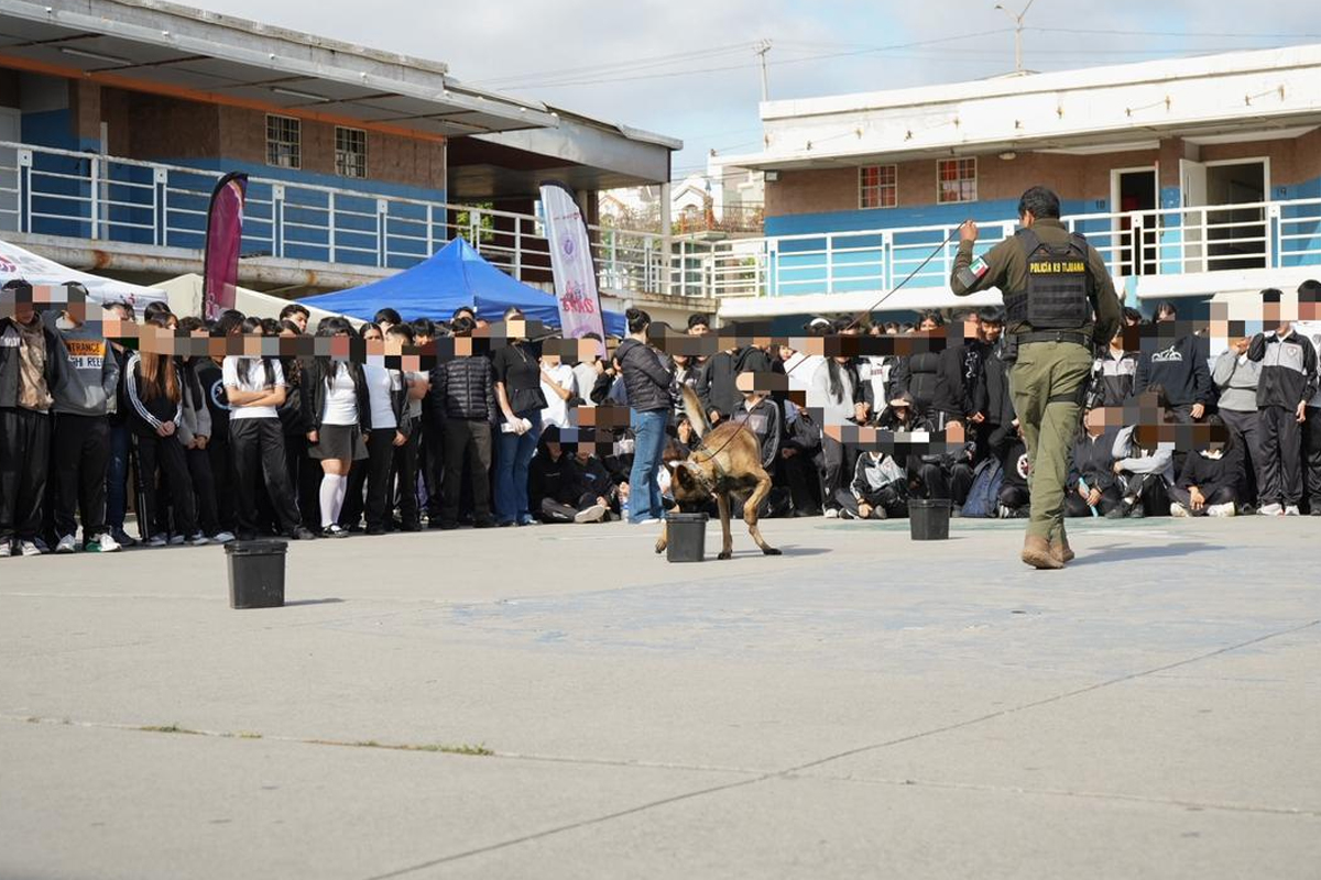 Como parte de las actividades, la Unidad de Operaciones Caninas K9 realizó una demostración de habilidades, donde se mostró el trabajo de los agentes caninos en la detección de sustancias ilícitas, destacando la importancia de estas acciones en la prevención dentro de entornos escolares.