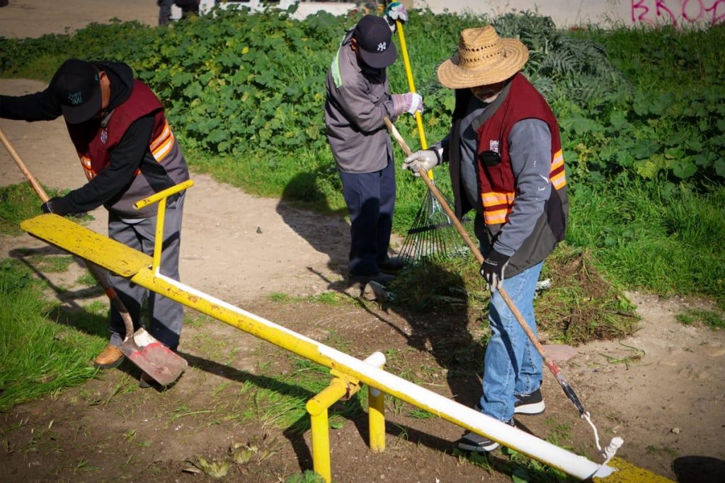 Posteriormente, en la colonia Loma Bonita, fraccionamiento Lomas Verdes, en la delegación La Mesa, se realizaron labores de limpieza y mantenimiento en áreas verdes que abarcaron una superficie aproximada de mil 200 metros cuadrados. Las acciones incluyeron poda de palmas en una cancha de usos múltiples y en un canal pluvial, rehabilitación de juegos infantiles y recolección de 1.5 toneladas de basura, beneficiando a alrededor de mil 500 personas.
