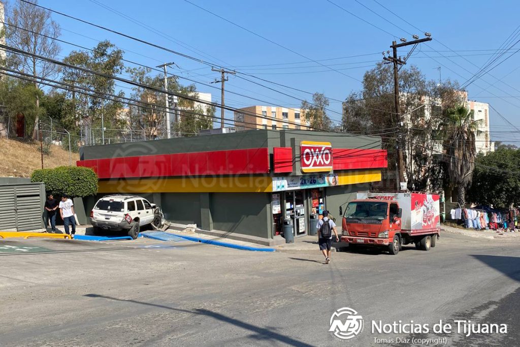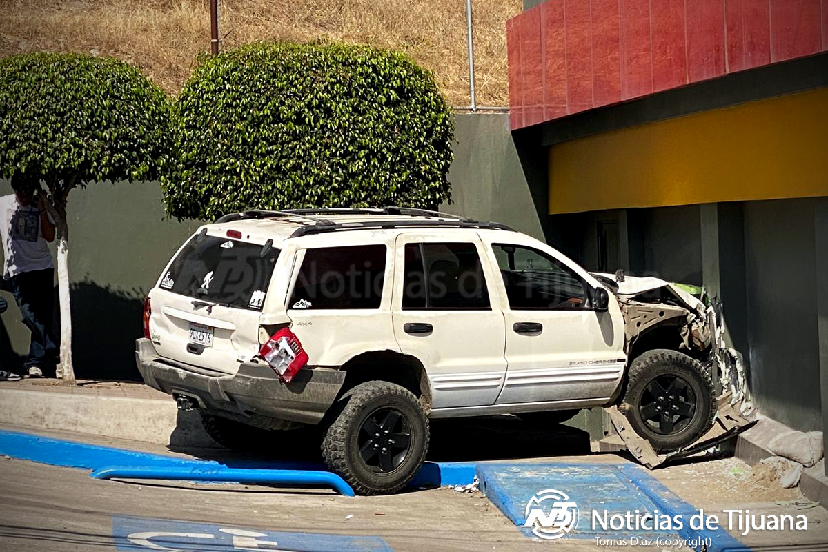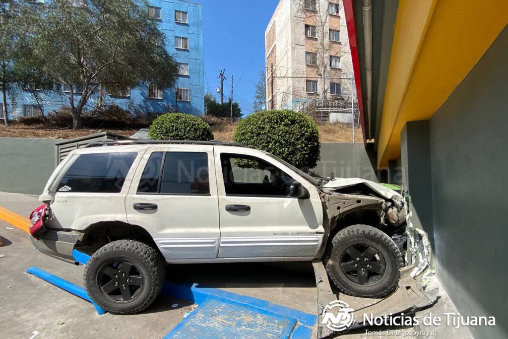 Una joven conductora de una Jeep Grand Cherokee protagonizó un accidente en la calle Haitianos de la colonia Infonavit Cachanillas, al colisionar contra la pared de un edificio y posteriormente contra la de un Oxxo.