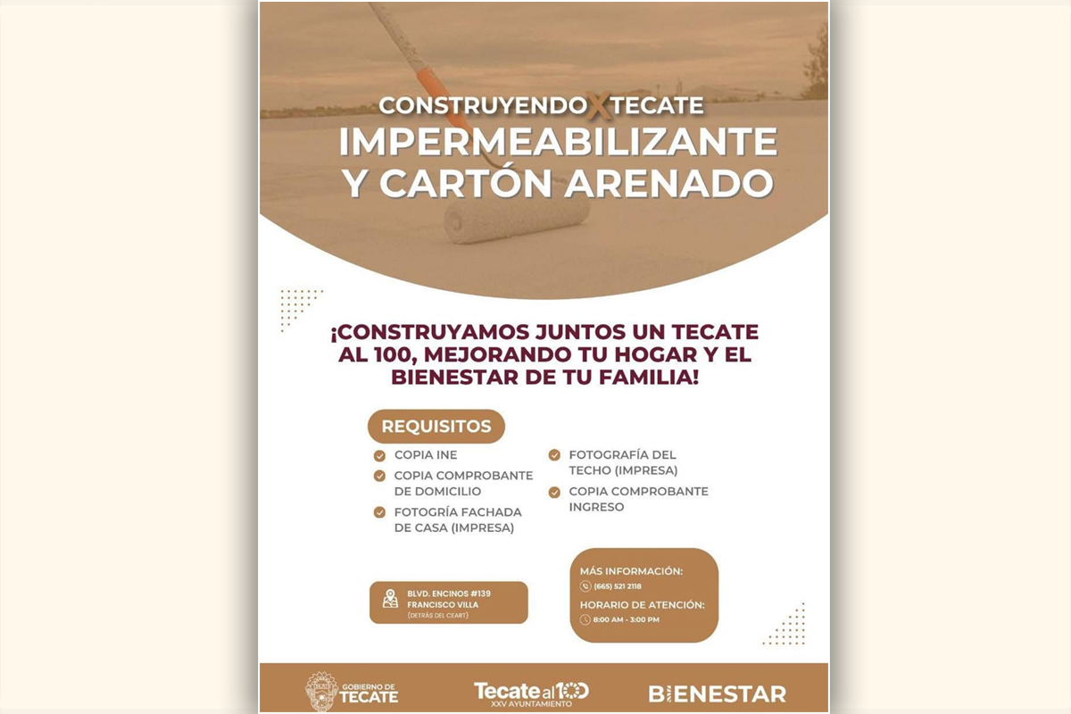 Con la finalidad de apoyar a familias en situación vulnerable y mejorar las condiciones de sus viviendas antes de la temporada de lluvias, el Ayuntamiento de Tecate abrió la convocatoria del programa “Construyendo X Tecate”, que ofrece materiales como impermeabilizante y cartón arenado.