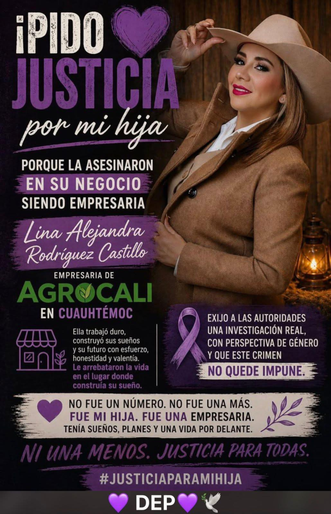 Cuauhtémoc, Chihuahua. (NDT).– La empresaria y líder ganadera Lina Alejandra Rodríguez Castillo fue asesinada al interior de su negocio, “Agro Cali”, tras un ataque perpetrado por al menos tres personas, quienes también dejaron lesionada a otra mujer que se encontraba en el lugar.