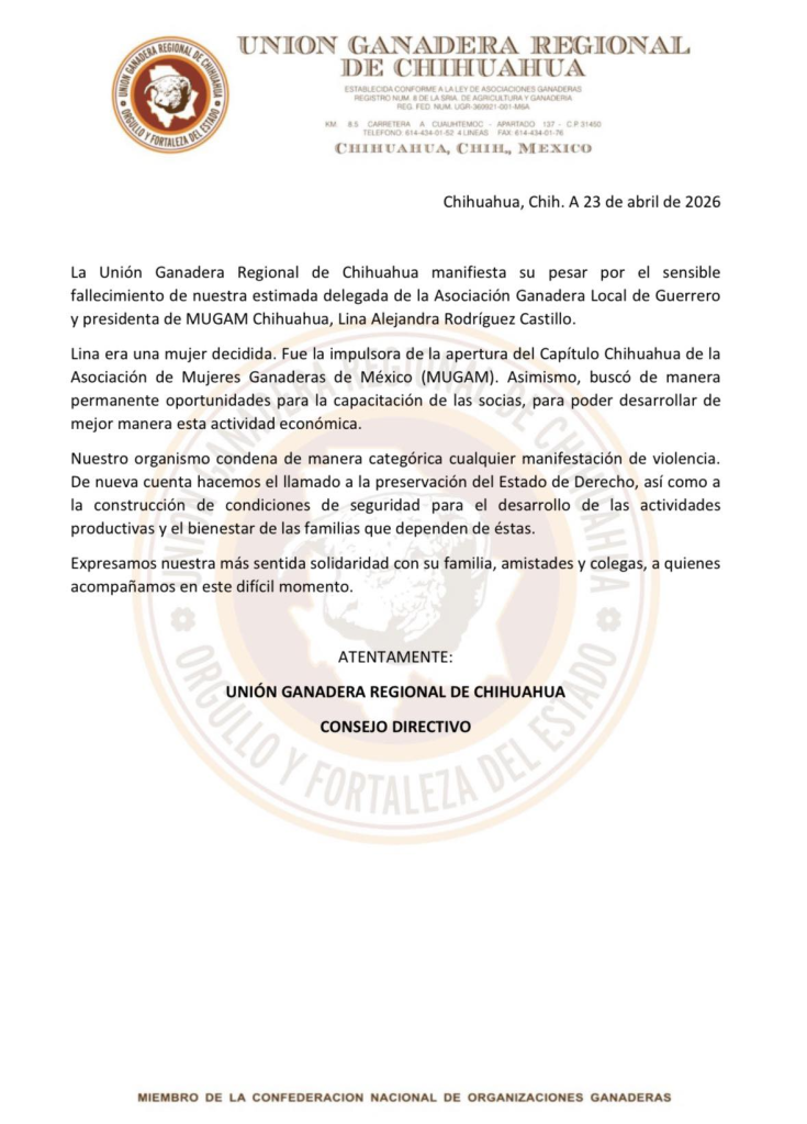 La Unión Ganadera Regional de Chihuahua condenó el crimen y exigió condiciones de seguridad para el desarrollo de las actividades productivas, además de reiterar el llamado a preservar el Estado de Derecho. En un posicionamiento, el organismo destacó la trayectoria de la víctima, a quien describió como una mujer impulsora del capítulo Chihuahua de MUGAM y promotora de la capacitación para mujeres del sector.