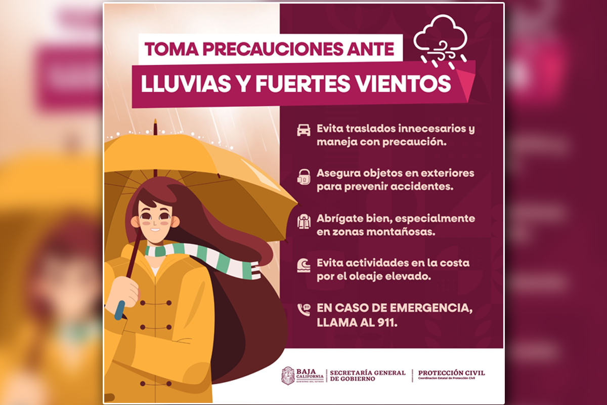 La Coordinación Estatal de Protección Civil alertó por la presencia de lluvias fuertes a muy fuertes en Baja California durante el cierre de año y el inicio de 2026, de acuerdo con pronósticos del Servicio Meteorológico Nacional. Las condiciones se prevén del miércoles 31 de diciembre al viernes 2 de enero.