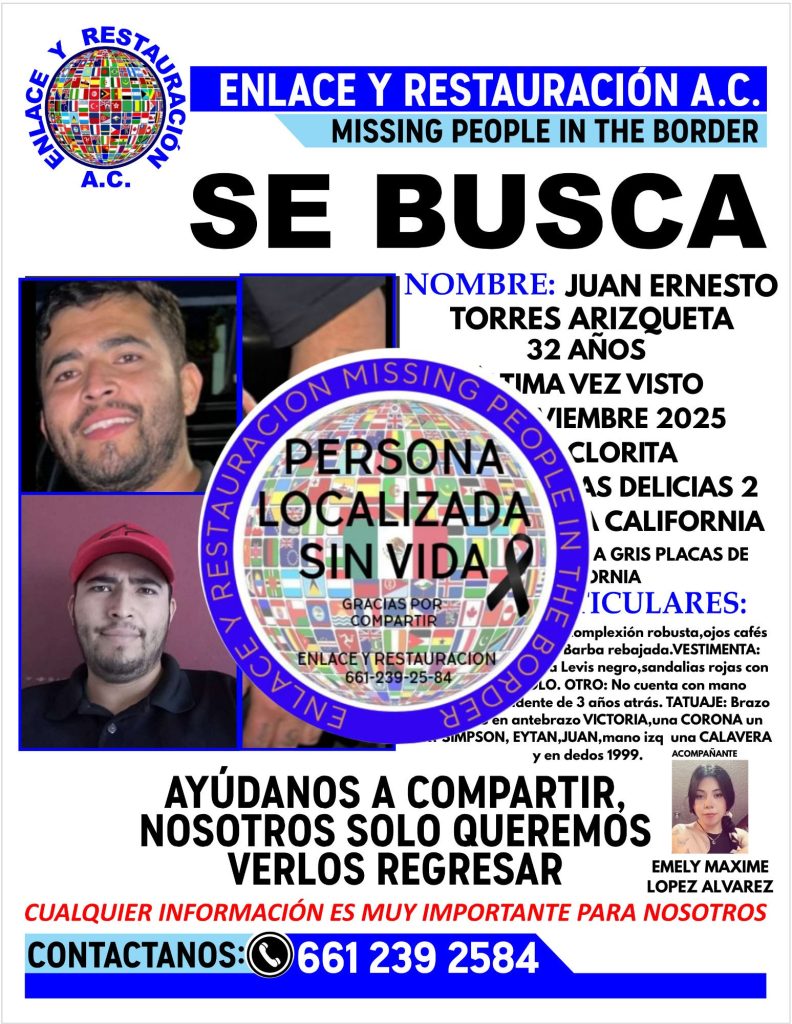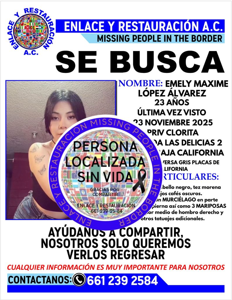 Emely Maxime López Álvarez de 23 años y Jesús Ernesto Torres Arizqueta de 32, fueron hallados sin vida en una fosa clandestina en la colonia Palma Real, en la Zona Este de Tijuana. Ambos habían desaparecido juntos la noche del domingo 23 de noviembre.