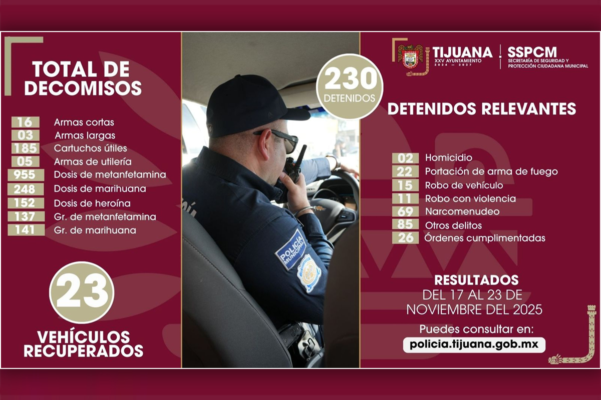 Más de 230 personas fueron detenidas y 19 armas de fuego fueron aseguradas durante diversos operativos realizados entre el 17 y el 23 de noviembre en Tijuana, como parte de acciones de vigilancia y prevención del delito en distintos puntos de la ciudad.