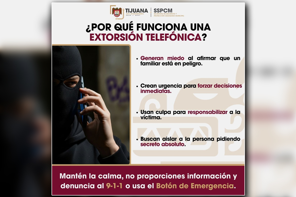 La Secretaría de Seguridad y Protección Ciudadana Municipal alertó sobre la incidencia de extorsiones telefónicas en Tijuana, un delito que se basa en la manipulación emocional de las víctimas y no en información real.