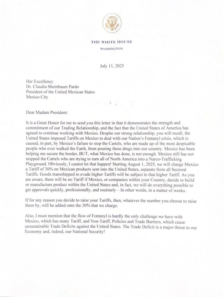 La mandataria se refirió a la carta enviada por el presidente Donald Trump el pasado 11 de julio, en la cual notificó su intención de aplicar un arancel del 30% a importaciones mexicanas a partir del 1 de agosto.