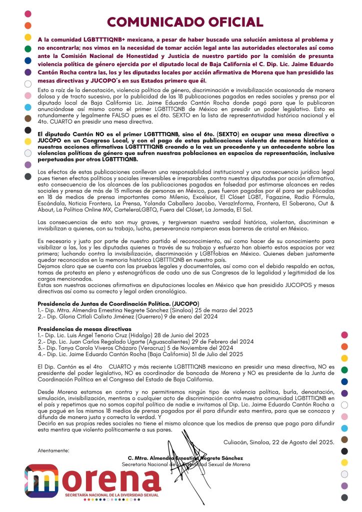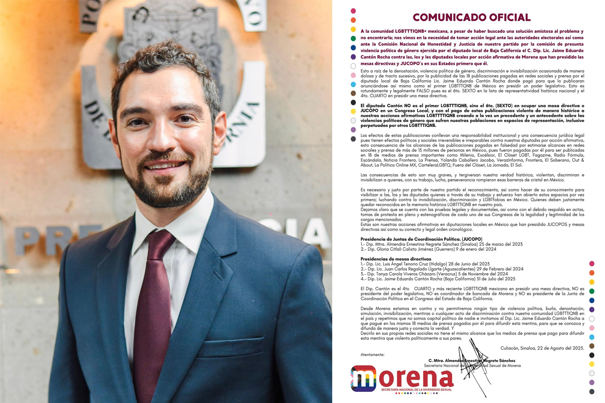 La Secretaría Nacional de Diversidad Sexual de Morena desmintió publicaciones pagadas vinculadas al diputado Jaime Eduardo Cantón Rocha, que lo presentaban como “el primer hombre LGBTTTIQNB en presidir un poder legislativo”.