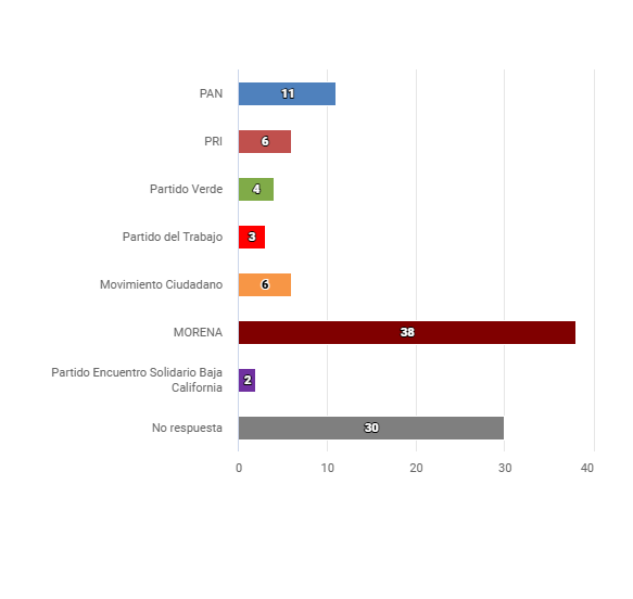 La contienda arranca con Morena a la cabeza, con 38% de las preferencias. Le siguen PAN (11%), PRI y MC con 6%, respectivamente, Partido Verde (4%), PT (3%) y el PES-Baja California con 2%. Es importante señalar que 30% de los encuestados no declararon preferencia por algún partido político.